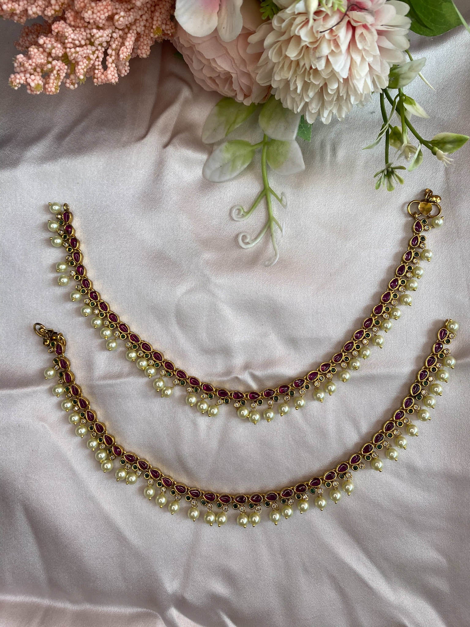 Kemp thilagam shaped anklets blend traditional craftsmanship with timeless elegance. These intricately designed pieces feature the distinctive thilagam motif—a sacred symbol in South Indian jewelry—rendered in rich kemp stone. Perfect for festive occasions, temple visits, or everyday wear, these anklets showcase authentic artisanal detailing. The kemp's warm, deep hues complement all skin tones while maintaining cultural significance. Lightweight yet durable, they offer comfortable all-day wear without compromising on aesthetic appeal. An ideal choice for those seeking genuine traditional jewelry with contemporary styling.